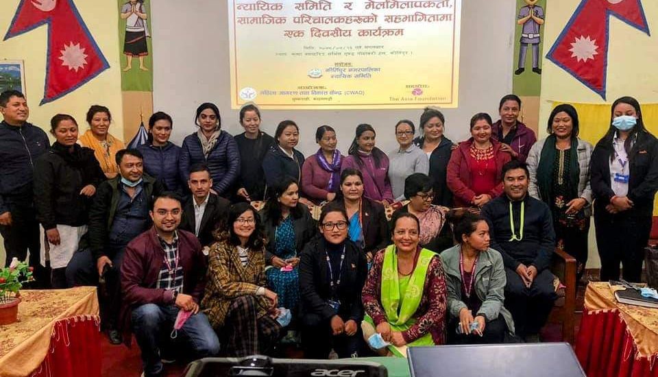 CWAD organized a one-day program in coordination with Kritipur Municipality on the 9th of November 2021 (Mangsir 23rd 2078). The program was attended by the Judicial Committee Members, Mediation Committee Members, Ward Members, Executive Members, Paralegals, Legal, Women and Children administrative officials of Kritipur Municipality. A total of 26 people participated among which 18 were female 8 were male. Deputy Mayor (DM) Saraswoti Khadka, Chief Administrative Officer (CAO) Krishna Prasad Sapkota, Anuj Pradhan Chief of Social Development Department, Pabitra Pariyar Women and Children Department, Prabin Kumar Sahi Chief Financial Officer of Municipality also attended the program.
