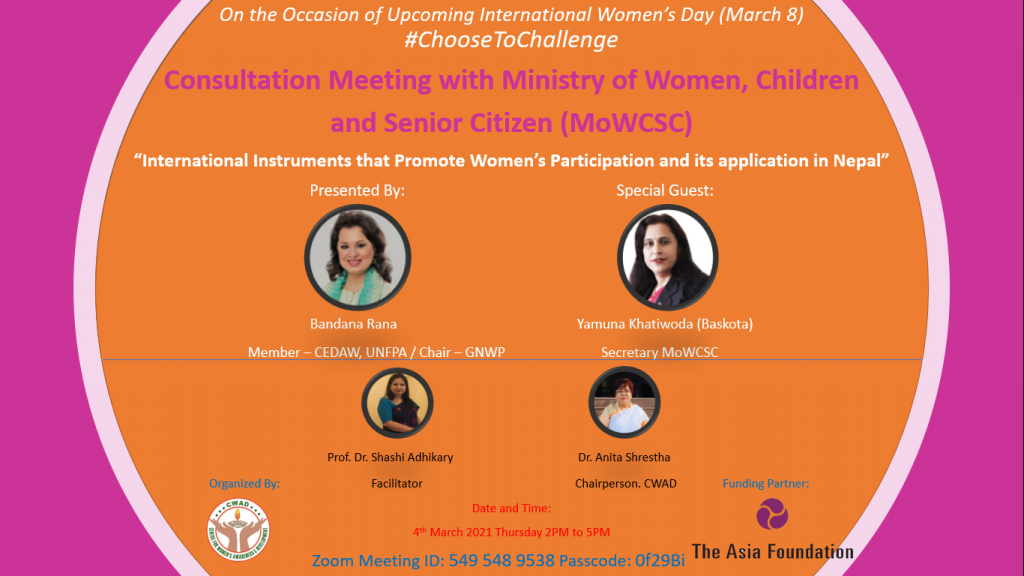 CWAD organized a second consultation meeting with the Ministry of Women, Children and Senior Citizens (MoWCSC) on March 4th, 2021 (Falgun 20th, 2077) from 2pm till 5 pm via zoom meeting to celebrate the upcoming International Women’s Day on March 8, 2021. The slogan for this year was #ChooseToChallange. Ms. Bandana Rana prepared a paper highlighting the international practices and the effective way to implement them. Similarly, we had organized our first consultation meeting with the Ministry of Women on 22nd January 2021 via Zoom, where the Secretary of Women Ministry Miss Yamuna Khatiwada (Baskota) highlighted the Gender Responsive Budget and Ministry work and action for women empowerment through her paper presentation. As these programs helped us share our views as well as aware about the work done by the government as well as the international practices with various instruments on the women’s participation and its effective implementation in the context of Nepal.