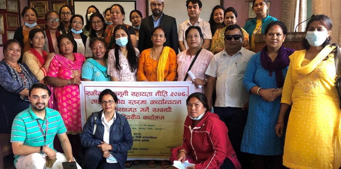 CWAD in coordination with Judicial Committee of Madhyapur Thimi Municipality, organized a One Day Program on 4th August, 2021 (Shrawan 20th, 2078). Judicial Committee Members, Mediation Committee Members, Ward Members, Executive Members, Paralegals, as well as Legal, Finance, Women and administrative officials of Kirtipur Municipality shown their active participation.